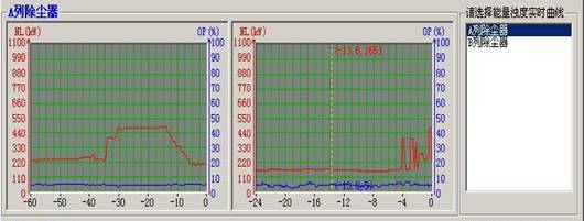 其节能能耗和排放效果也可通过能耗浊度曲线图反映:上图是A列电除尘能耗浊度曲线,红色曲线代表A列除尘器高压运行能耗趋势,蓝色曲线代表A列除尘器出口烟气浊度变化趋势,左边为1小时变化曲线,右边为24小时变化曲线。左边曲线显示了系统从节能模式到常规模式(不节能)、再到投入节能模式的一个变化过程,表明系统在工作模式的变化过程中浊度相对稳定,说明了节能模式的运行并没有影响除尘效果,节能有效。