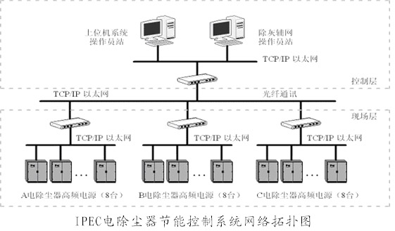 IPEC节能控制系统改造。针对高频电源控制器“工况自动检测”,增加节能参数调节功能、节能数据处理功能,IPEC系统的网络拓扑结构如下:
