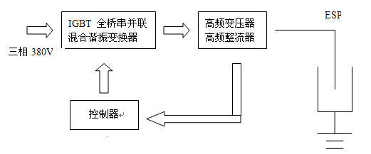 高频电源原理上主要由三大块组成,即变换器、高频变压器、控制器,如图所示。三相交流输入整流为直流电源,经逆变为高频交流,最后整流输出直流高压。变换器实现直流到高频交流的转换,高频变压器/高频整流器实现升压整流输出,为ESP提供供电电源。