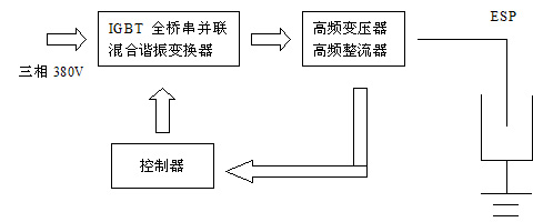 电除尘用高频高压整流设备(简称高频电源)将工频三相交流电源整流后经高频逆变、升压、二次整流后变换成直流负高压输出,可配套各类除尘设备广泛应用于电力、冶金、建材、轻工、化工等众多行业的烟气粉尘治理,是一种高效的除尘、保护环境的重要设备。该产品具有输出纹波小、平均电压电流高、转换效率与功率因数高、采用三相电源对电网影响小、体积小、重量轻、设备成套一体化等多项显著优点,它的研制成功实现了电除尘器配套电源技术水平质的飞跃,是我公司充分利用多年电除尘配套电源研发、生产及应用经验,完全依靠自主创新在电除尘器供电前沿技术方面取得的又一项高新技术产品,并具有完全自主知识产权。经鉴定该成果属国内首创,达到国际先进水平。